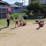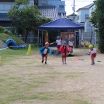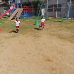走るの気持ちいいな!走るのってとっても楽しいな!そんなみんな、自然とかけっこが始まって、いつの間にかリレーになりました。