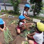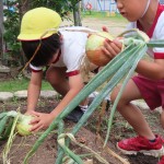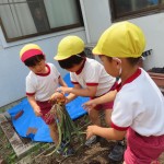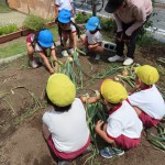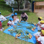 昨年度から育てていたたまねぎが大きく育ちました。みんなで収穫しました!大きな大きなたまねぎがでてきて、みんな「家族んみんなでかれーたべれるわ!」「大きなオムライス作ってもらおうかな?」と大喜び!でした。