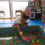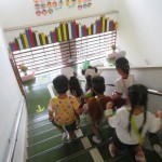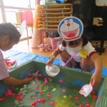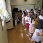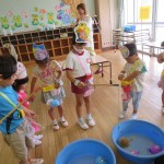 今日は岸城幼稚園に行き、一緒に夏祭りに参加しました。各部屋で用意してくれた遊びコーナーを3・4・5歳児の縦割り班で回りました。