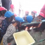 それから、きすぁだの漁港でとれた、フグやサメを見たり、とった魚を冷やしておく冷蔵庫を見たり、最後にセリをする場所にも案内していただきました。