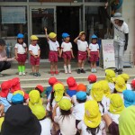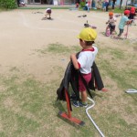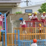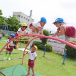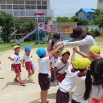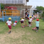 年中児は初めての環境・友達・先生に始めは緊張気味でしたが、年長さんに教えてもらったり、着いていったりしながら遊ぶうちに、徐々にリラックスしていつもの様子で、楽しんで