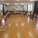 岸城幼稚園との交流保育で、年齢別に分かれて絵を描きました。