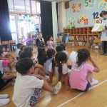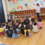 年中児は一つのグループで、年長児は2冊絵本を読み、描きたいお話の絵を選んで2グループに分かれました。