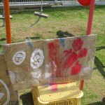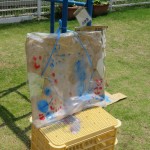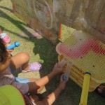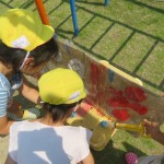 みんなが絵の具で描いて作った大きな的で水鉄砲したら・・・2つの絵の具の色が水鉄砲で打つたびに混ざって、「わーピンクの色水できてる!」「こっちは水色や!」