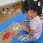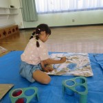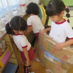 教師が用意した的で水鉄砲を楽しんでいたみんな。「先生もっと難しくしたい」「大きい的作りたい」と言うことで、的造りが始まりました。