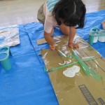尾どもたちが見つけてきたのは、ダンボール。そこに絵の具で絵を描こう!いい的が出来上がりました。