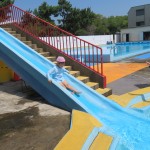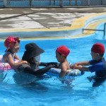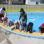 滑り台を滑ったり、ビーチボールや浮き輪で楽しんだり、ワニやラッコになって動いたり、汽車のようにつながって進んだり、