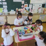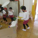 どんどん大きな基地になっていきました。「あっ!ドアもいるね」「屋根どうする?」「鍵も作ろう!」とみんなのアイデアでどんどんたくさんのグッズができてきました。
