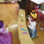 という提案がありました。すると、それにみんなも賛成!とみんなで、いるものを相談したり、今まで作ったものをつなげたりして、