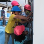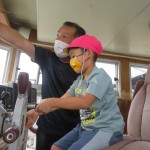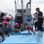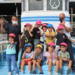 船の乗って、運転席に座らせてもらったり、魚群探知機を見せてもらったり、船の中を探検しました。