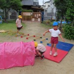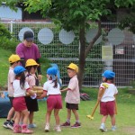 1年生が幼稚園にきて、園庭で一緒に遊んだよ!園児が作った迷路に、1年生も「楽しい!」「ここ難しいな」と挑戦していて、園児が嬉しそうに見守る姿や、年長児は久しぶりに昨年度の