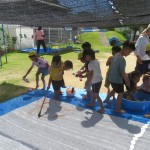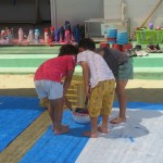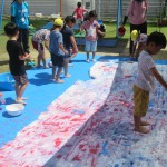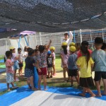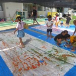 園児だけで楽しんでいたスプラトゥーンバトルを1年生としました!人数が多いので、4色に分かれて2つのスペースで、2バトル同時にしました!