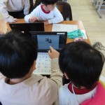 立腰の大切さを教わり体験して、足指体操をして、それから国語と算数を、タブレットや電子黒板、プリントを使ってしまいした。