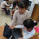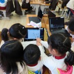 タブレットや電子黒板!新鮮な環境でした。起立・礼も1年生と一緒にして、授業が始まりました。