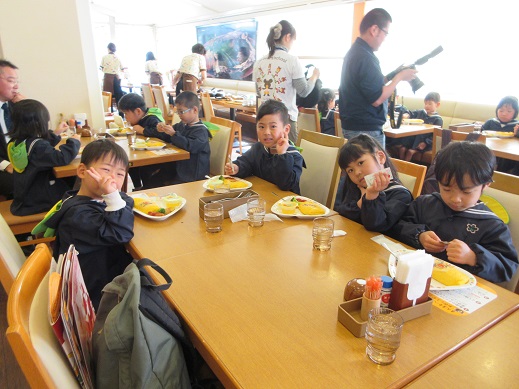 お昼ごはんは、楽しみにしていたお子様ランチ♪オムライスにポテト、ウインナーに大満足の子ども達でした。楽しかったね!