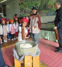 数日前に、幼稚園委員さんお手伝いをしてもらって もち米洗いをしました。 そして、楽しみにしていたお餅つき! 園児のお父さん、おじいちゃん、PTA役員の皆さん、幼稚園委員さん、地域の方、小学校の先生方と たくさんの方のご協力で、お餅をついたり丸めたり、最後はお楽しみきなこ餅を食べて楽しい、楽しいお餅つきになりました。 お手伝い下さった皆様の、おかげで子ども達が貴重な経験をすることができました。 本当に、ありがとうございました。