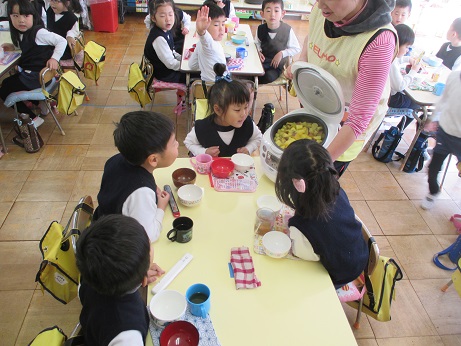 幼稚園で収穫したさつまいもを使って、スウィートポテトづくりをしました。袋の中に、蒸したさつまいもと、砂糖・バター・フレッシュを入れて、手でモミモミ・・・。ぎゅっ、ぎゅっと握ると丸くなり、ホットプレートで表面を焼きました。甘~い匂いが部屋いっぱいになり、子ども達も出来上がりを待ちかねていました。「できたよ!」の声で、大急ぎで「いただきま~す!」。今回はいただいた紫芋ポテトもしたので、楽しみは2倍!食べ比べをしながら楽しんでいました。2回目は、さつま芋ごはんパーティーです。炊きあがったご飯のにおいを嗅ぎ、「早くたべよう!」コールです。あまりお家では食べる機会がないさつま芋ごはんですが、子ども達は「おいしい!」「あま~い!」と大好評で、何回もおかわりをしました。また、大根と油揚げの味噌汁も一緒に食べましたが、こちらも大きなお鍋が空っぽになりました。今度は、おにぎりパーティーがあります。お楽しみに!