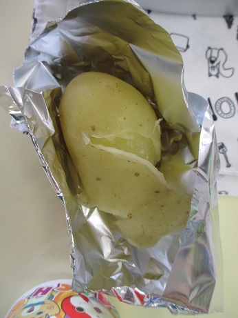 年長児が寒い冬に植えたじゃがいも。季節が進むのと同時に土の中でぐんぐん生長し、収穫の日を迎えました。収穫前には、じゃがいもの花の色の違いに気付いたり、葉っぱの色が少しずつ変わる様子を見てきたりした子ども達。土の中から出てきたのは、ゴロゴロたくさんのじゃがいもでした!「自分の手より大きいよ」「これはゾウさんサイズやなぁ」と小さな手で頑張って掘りました。タライにいっぱいのじゃがいもに大喜び♪その日のお弁当の時間に早速茹でて食べました。ホクホクで自然の甘味がたっぷりのじゃがいも。疲れた顔も美味しくてニッコリ笑顔になりました。次は、楽しみにしているカレーパーティーで食べようね!