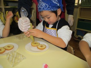 午後からはアフタースクールでクリスマスリースドーナツのクッキングをしました。 半分に切ったドーナツにさつまいもあんを挟んで シロップをかけて トッピングをしたら できあがり! 「おいしい」とすぐにお皿は空っぽになりました。