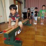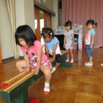 平均台を使って、おサルさんの橋渡ごっこや