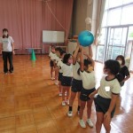 年長児は、ボールおくりゲームをし、白熱していました。