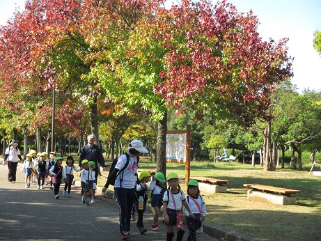 10月31日(火)に近隣の岸和田市立幼稚園(春木・大芝・大宮・城北・新条)が中央公園に大集合!幼稚園からは30分ちょっとかけて無事に到着!子ども達は疲れも見せず、ニコニコ笑顔。初めて出会うお友達とも、一緒に体操や、デカパン競争、リレー、ふれあい体操をするうちに、あっという間に仲良しに。お天気も最高によくて、澄み渡る秋空をバックに、のびのびと遊ぶことが出来ました。近くには、どんぐりや木の実が落ちていて、子ども達も大興奮!たくさんのお土産を拾って幼稚園に帰りました。