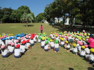 中央公園に大宮・城北・新条・大芝・春木の5園の子ども達が集まり、 一緒に体をいっぱい動かして遊びました。 体操をしたり 5園の子ども達混合の5チームを作り競争をしたり 最後に優勝したところには優勝カップを贈呈してもらいました。 その後には、他園の友達と仲良くダンスをしました。 お弁当の後には、公園の自然を満喫して遊びました。 「おもしろかった!ただいま!」と笑顔いっぱいで帰ってきました。