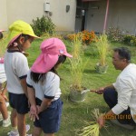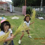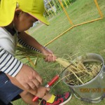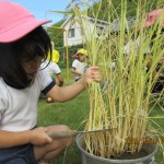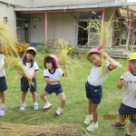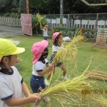 幼稚園の園庭で大切に育てていた稲の収穫をしました。