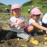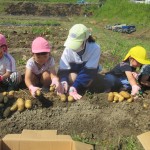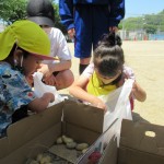 委員の皆様が、土を掘り起こしてくださっていたので、たくさんのじゃがいもが出てきて大喜びの子どもたちでした。今日は職場体験の中学生も来ていたので、みんなで力を合わせてがんばりました!