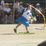 幼稚園の最初の出番はリズム表現です♪ かわいいタヌキに変身して踊りました。後半は長いリボンを使ったダンスです!