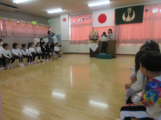 今日の修業式では、少し緊張した面持ちで年中さんといちご組さんが園長先生から修業証書を頂きました。