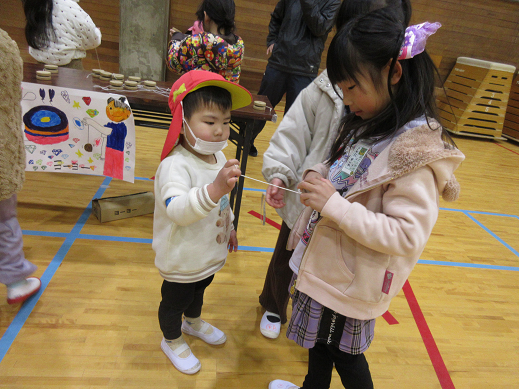 1年生が準備をしてくれた各コーナー(けん玉・こま・めんこ・ヨーヨー・折り紙遊び)をグループでまわりました。