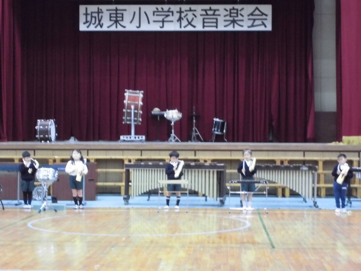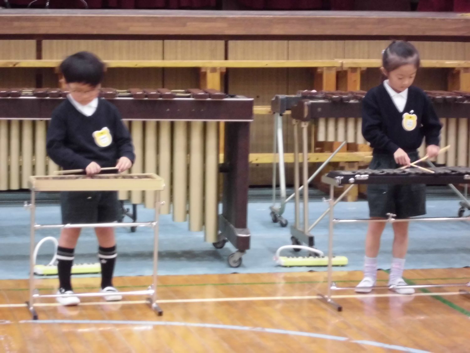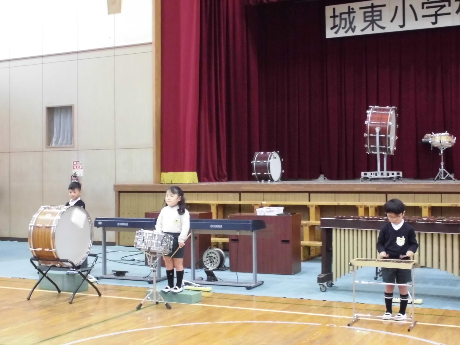 大太鼓や小太鼓、木琴や鉄琴、タンバリンやスズを使って演奏しました。