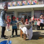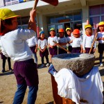 さて、いよいよ当日!朝から見たこともない用具(臼や杵など)を見て、子ども達も「あれは何?」「おもちつき早くしたい!」とドキドキ☆