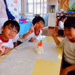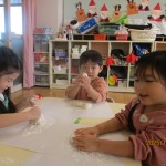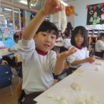 「食べたいなぁ・・・。」「手にくっつく~!」とおもちの感触を楽しむ子ども達。
