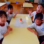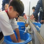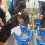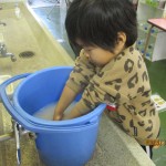前日に、もち米洗い。子ども達は「お米を洗うと水が白くなった!」「お米のいい匂いがするね」「どうやっておもちに変身するの?」と、気づいたことや感じたことを言葉で表現♪ 「おいしいおもちになあれ!」と明日のおもちつきを楽しみにしている様子でした。