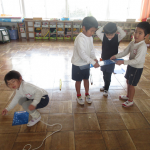2月20日、生活発表会に向けて年長さんは2チームに分かれて創作劇を、年中さんは年長さんと一緒に桃太郎になって遊んでいます。