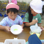 1学期幼稚園で一緒に水遊びをして、そのアイデアから色々な水の遊びを考えて準備してくれました!