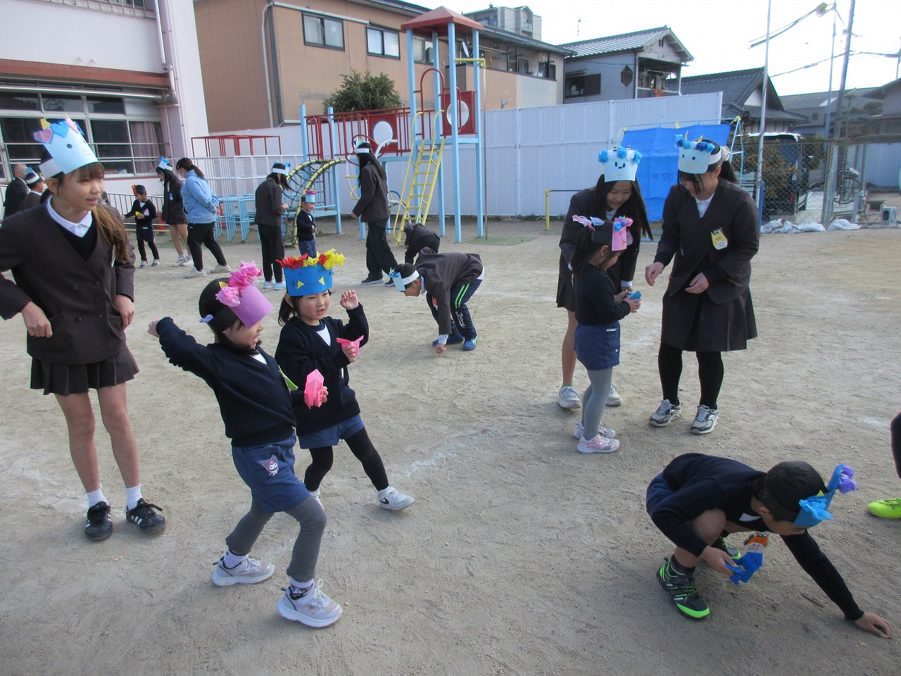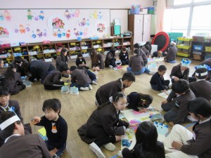 2回目は、一緒に豆まきをしました。「鬼はー外!福はー内!」と、鬼役の5年生に豆を投げました。