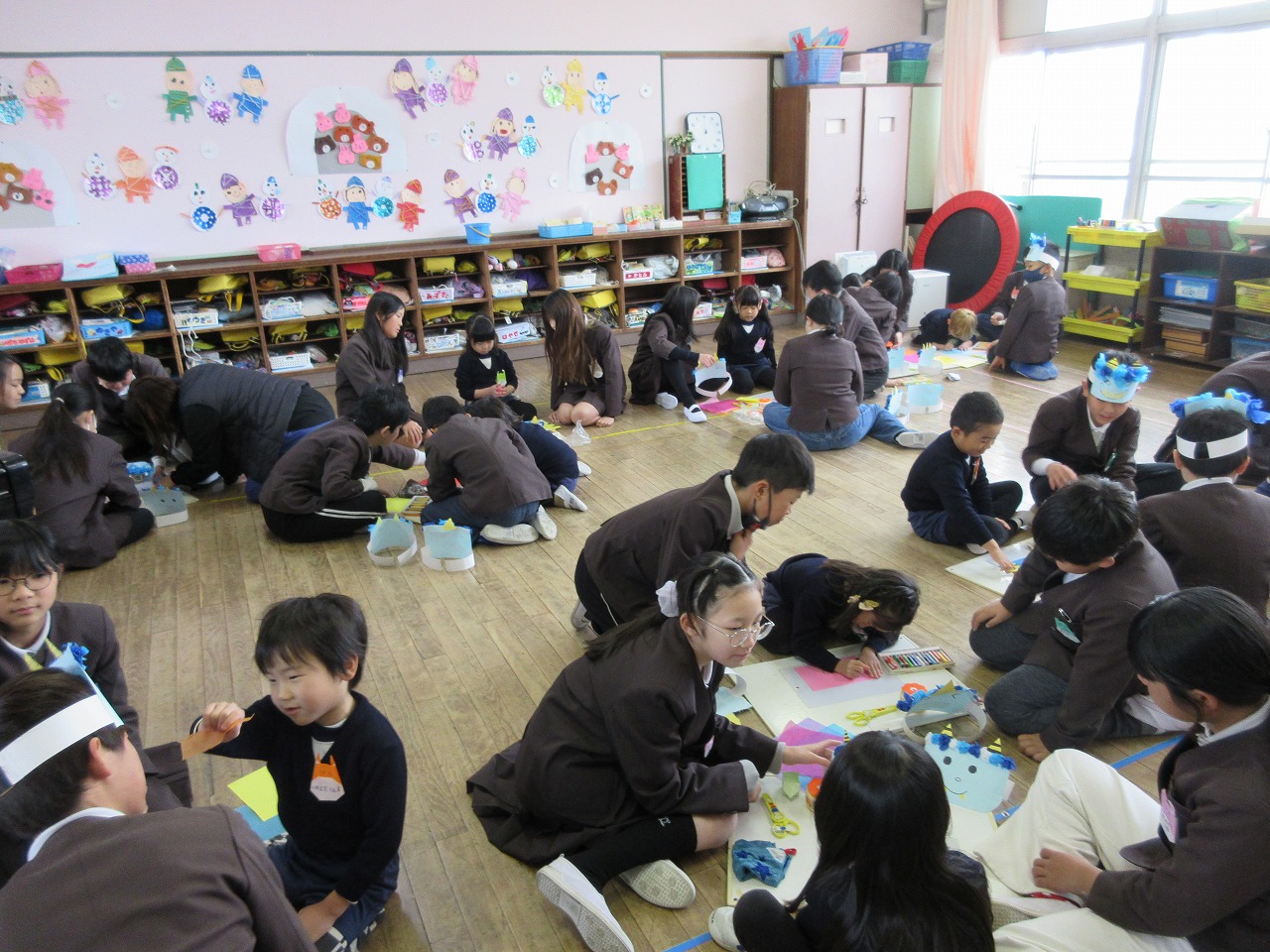 5年生がやさしく教えてくれたり、手伝ってくれたりして、すてきなお面ができました。