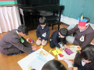 1回目は、一緒に鬼のお面と豆を入れる三方(4.5歳児)やコップ(3歳児)を作りました。