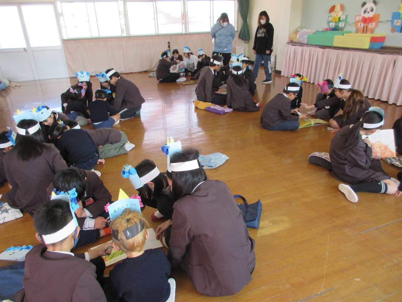 そのあと、室内で5年生が選んだ絵本を読んでもらいました。また、「小学生になったらこんなことができるよ!」と、大縄やリフティングなどをやって見せてくれました。