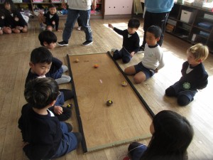 3学期から、コツコツ取り組んできたコマ回し。みんなやる気満々です。