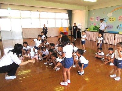 「Stand up!」「Sit down!」「Jump!」など先生の声に合わせて、歓声をあげて体を動かしていました。