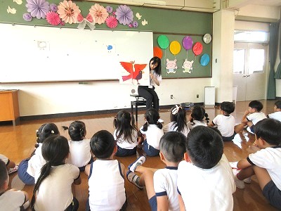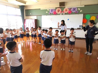 小学校にいる英語の先生に来ていただき、ひまわり組の子どもたちが英語に親しむ機会がありました。