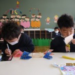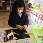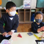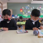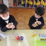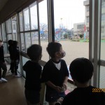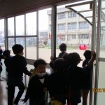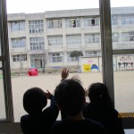 その後、外でも元気いっぱい遊んで、、、今日は、寒さが少しマシかなぁなんて言っていたらなんと、お弁当の後、窓の外を見ると雪がぱらぱら…。きれいだなーと眺めていると、みるみるうちに吹雪いてきて…「きゃあー!すごーい!!」「積もってほしい!」園児たちの声が聞こえたのか、目の前の校舎の窓が開いて、「おーい!」「ばいばーい!!」などと小学生と声をかけ合う姿も見られました。思いがけない雪に大はしゃぎの子ども達でした!!