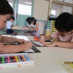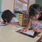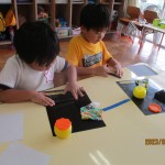 年長児は、折り紙遊び、年中児は魔法の絵の具遊びをしました。