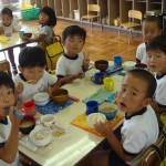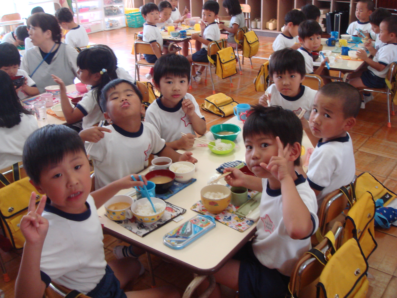 園庭で収穫した野菜が入ったみそ汁と、炊き立てご飯を昼食に食べました!食べた後の食器は、自分達で洗いました!また、水遊びも楽しんでいます!