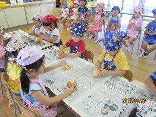 年少さんは玉ねぎの皮むき係、年長さんは包丁で野菜を切る係で自分たちでカレーの用意をしたよ!!
