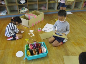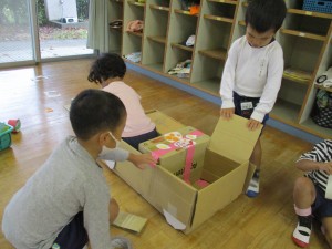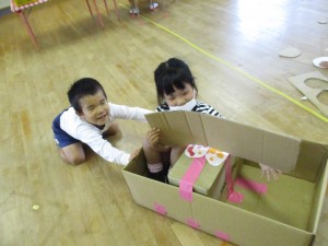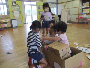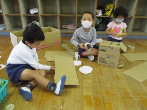 「先生段ボールちょうだい!!」と年長児が言い、少し何か作り出すと、他の子も集まって来て、バスを作り出しました。